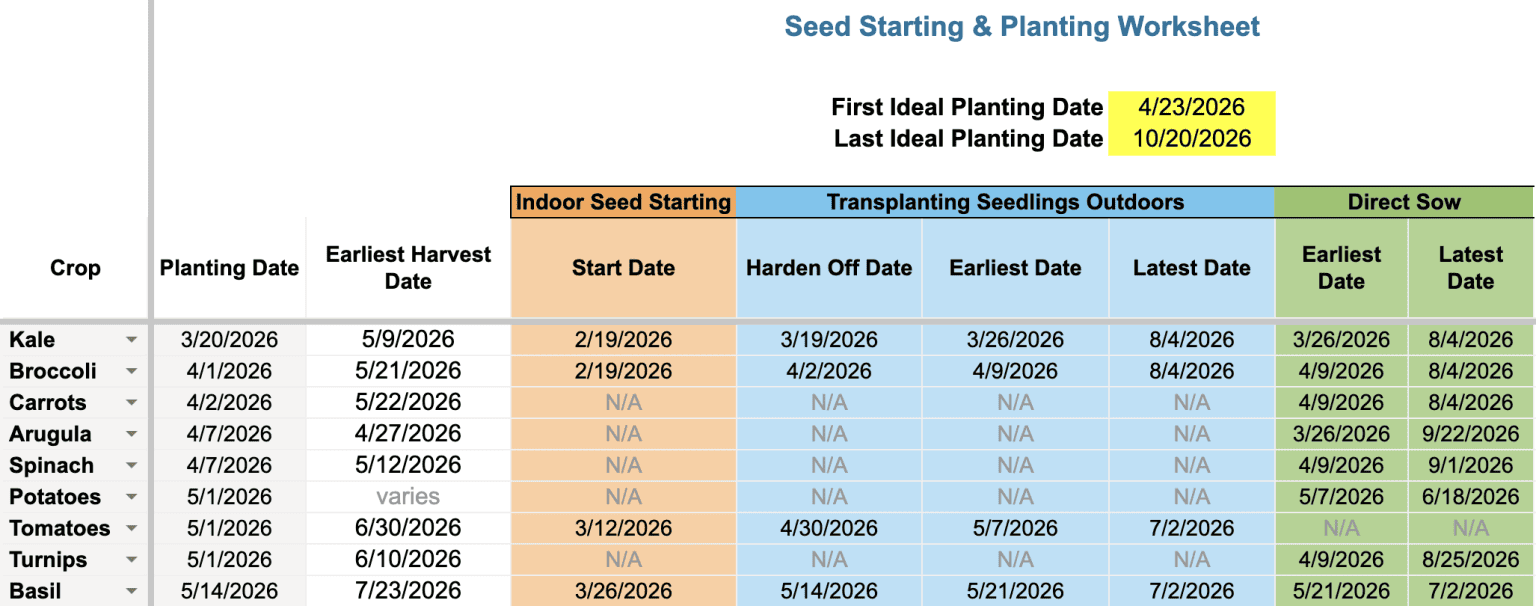 A Google spreadsheet that automatically calculates your unique dates for starting seeds indoors, hardening off, transplanting, direct sowing, and more, for over 50 popular vegetable crops, as well as some herbs and general fruit planting windows.