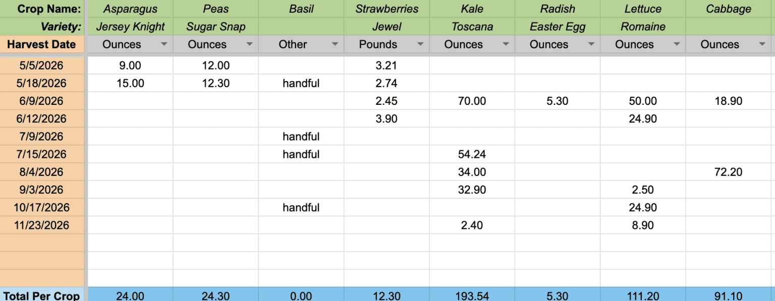 A Google spreadsheet that automatically tallies your recorded harvest amounts for each crop.